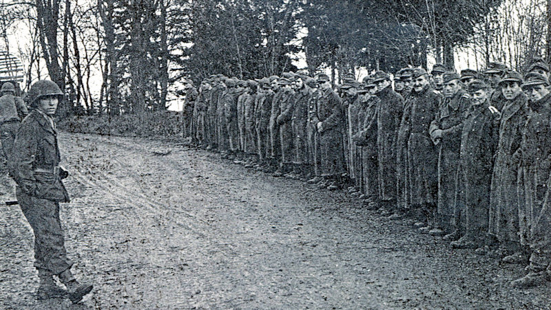 La photo montre la colonne de soldats allemands, fatigués, probablement affamés mais très certainement soulagés d’être en vie et que pour eux la guerre est terminée.
