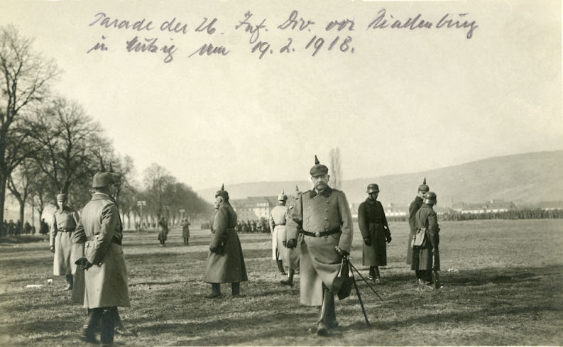 La photo montre le maréchal von Hindenburg entouré de ses officiers avec à l’arrière-plan les troupes en rang, la caserne d’infanterie et la colline de la Feste. Pour cause de secret militaire il n’existe pas de photo connue de visiteurs VIP à la Feste.
